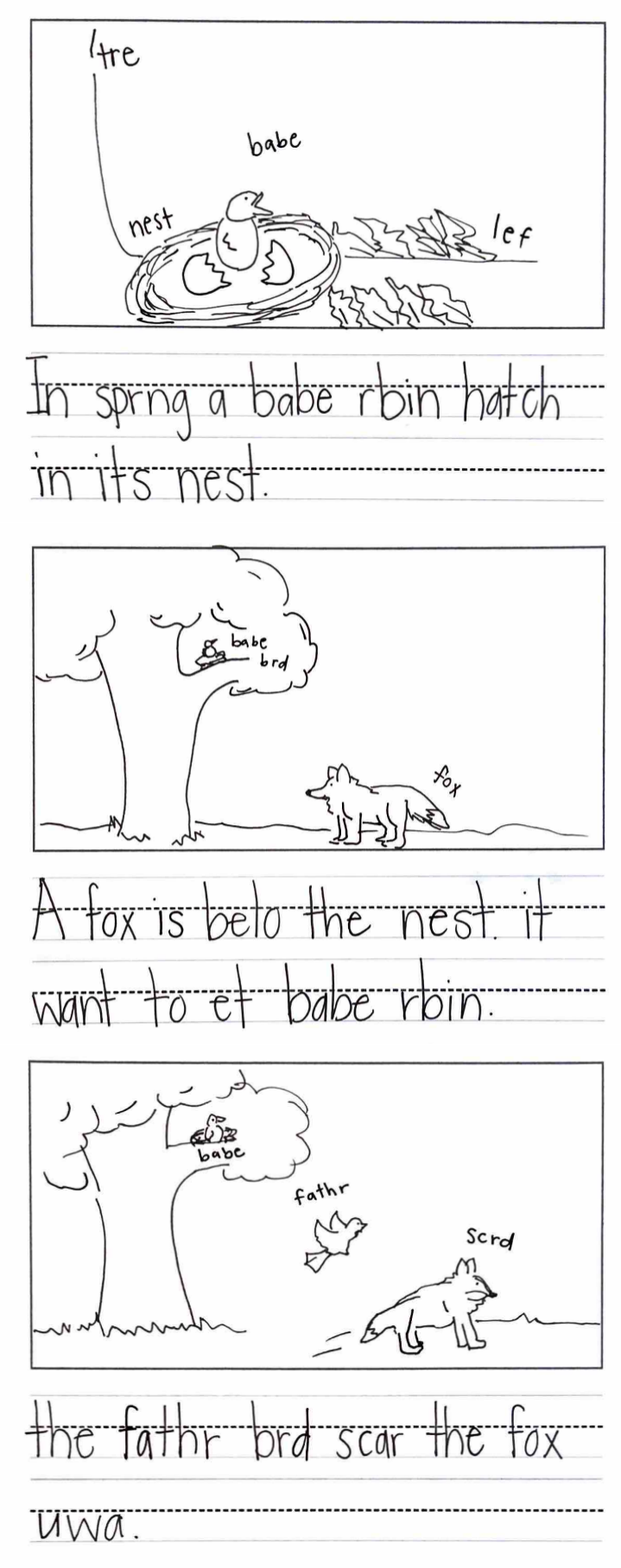 Brainstorm a story with a realistic beginning, middle, and end, using facts about the life cycle of a bird.